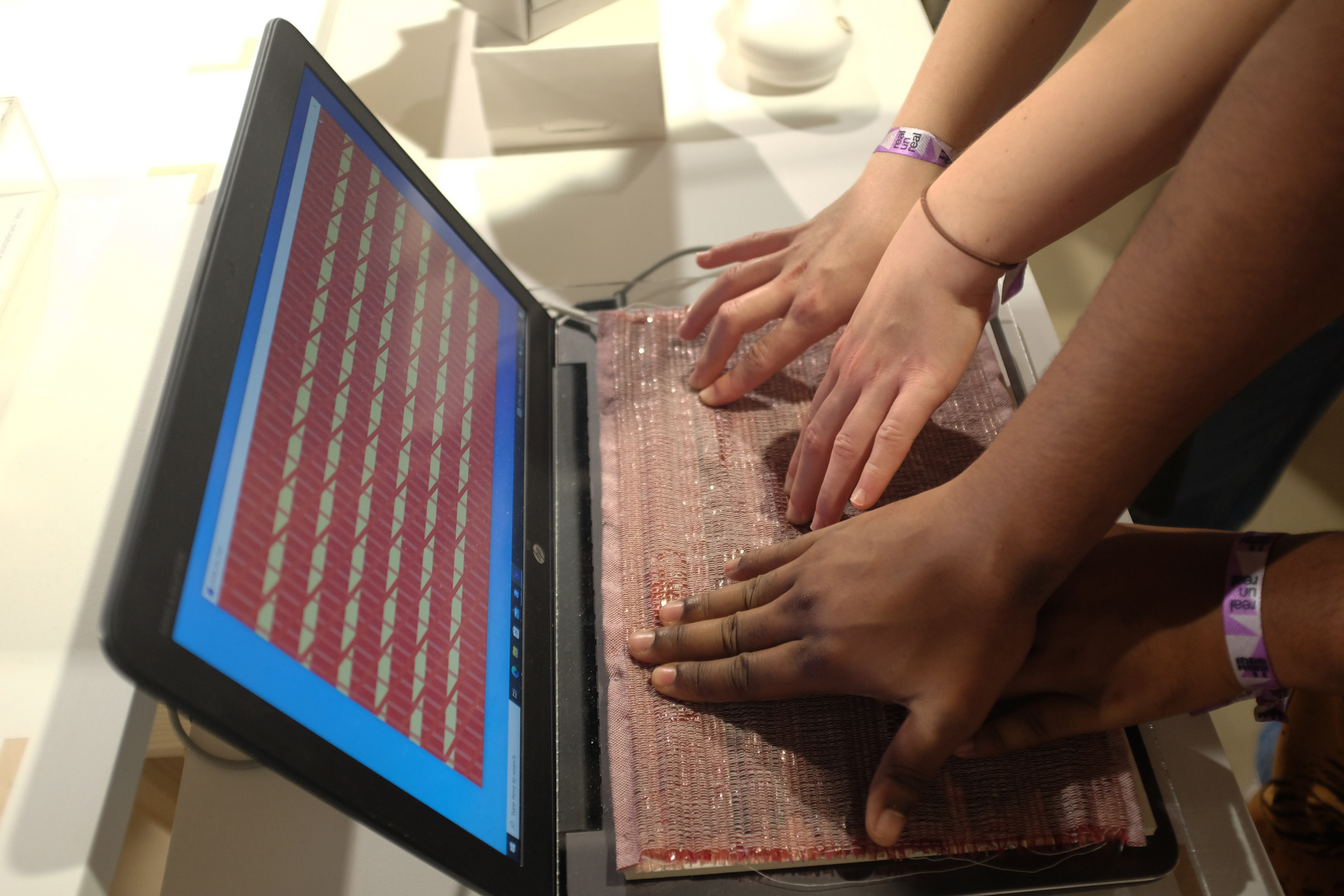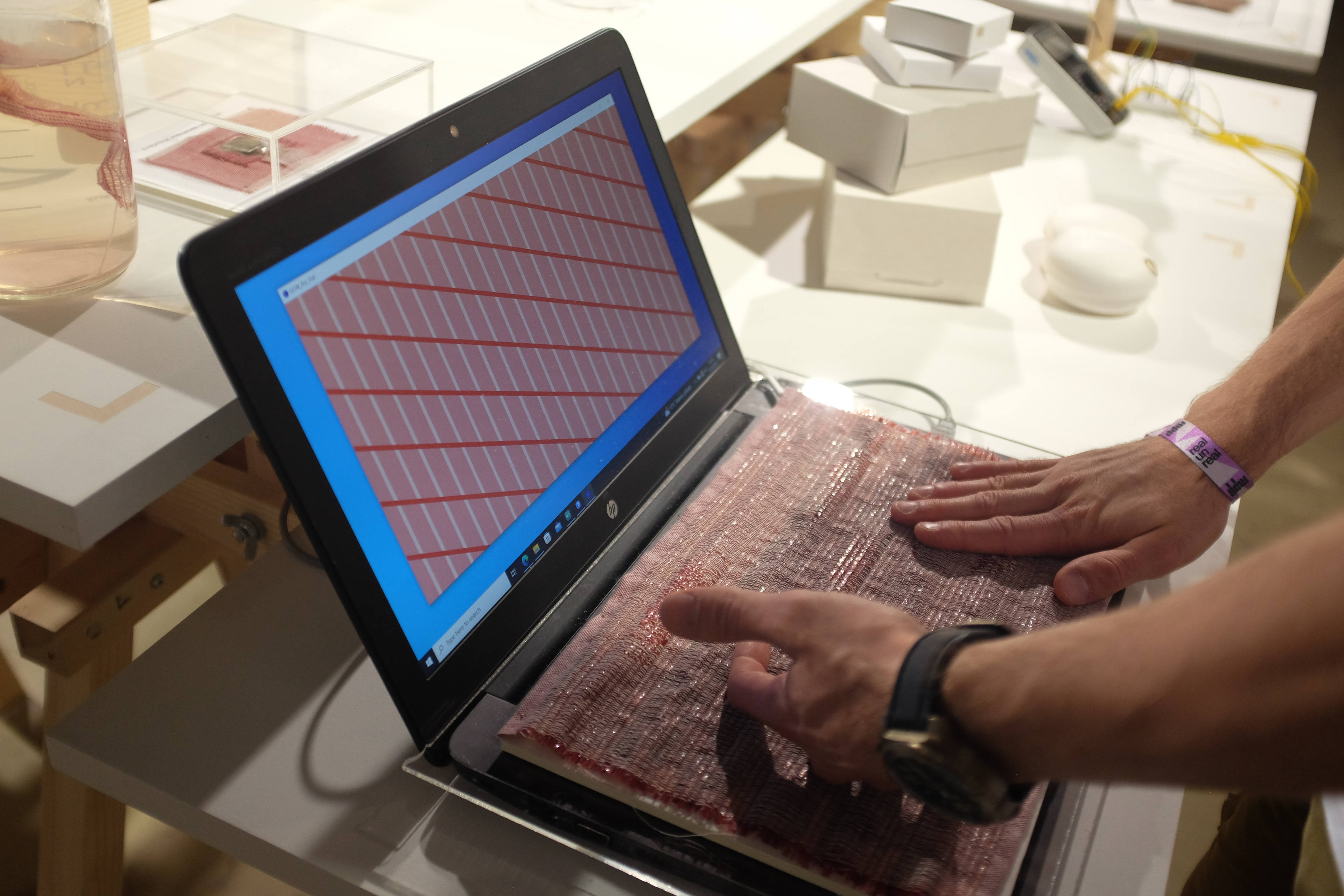 Interact with a woven bio-based interface made from wood cellulose, carbon-based conductive materials, natural dyes and fibres, designed to disassemble and degrade when its purpose is fulfilled.