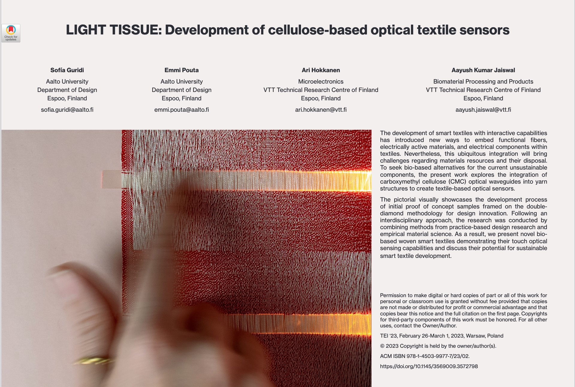 The pictorial visually showcases the development process of initial proof of concept samples framed on the double-diamond methodology for design innovation. Following an interdisciplinary approach, the research was conducted by combining methods from practice-based design research and empirical material science. As a result, we present novel bio-based woven smart textiles demonstrating their touch optical sensing capabilities and discuss their potential for sustainable smart textile development.